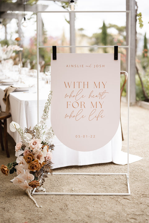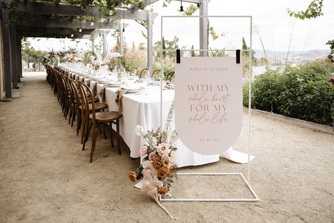 Their signage suite went a little bit viral (okay, a lot), and that welcome sign? The one that reads “with my whole heart, for my whole life”? Sweet, timeless, and apparently very inspirational — it’s officially my most copied piece ever.