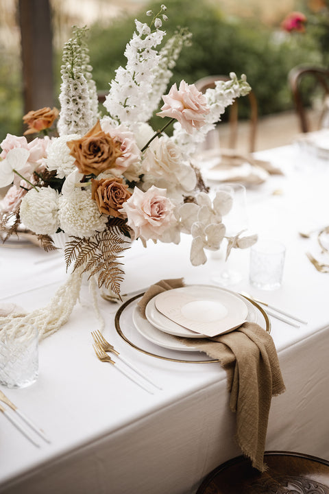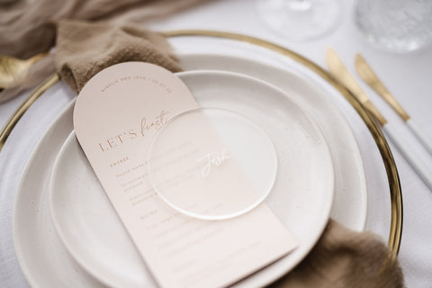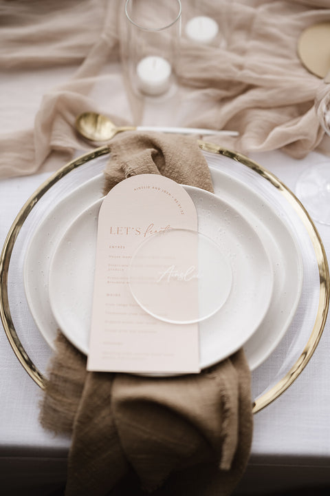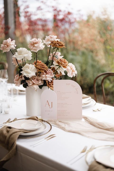 Ainslie & Josh weren’t just trendsetters though — they were all about the thoughtful details. Their clear frosted acrylic name places doubled as keepsake coasters (yes please to practical prettiness), and their duo bar signage was the perfect mix of fun and fancy. We played with a palette of dusky pinks and warm cinnamon tones — think soft, romantic, and just the right amount of spice.