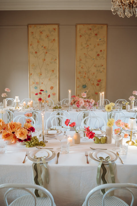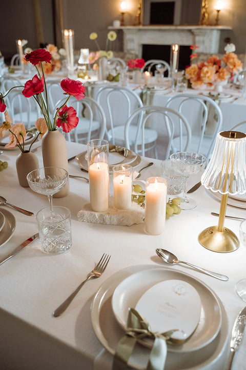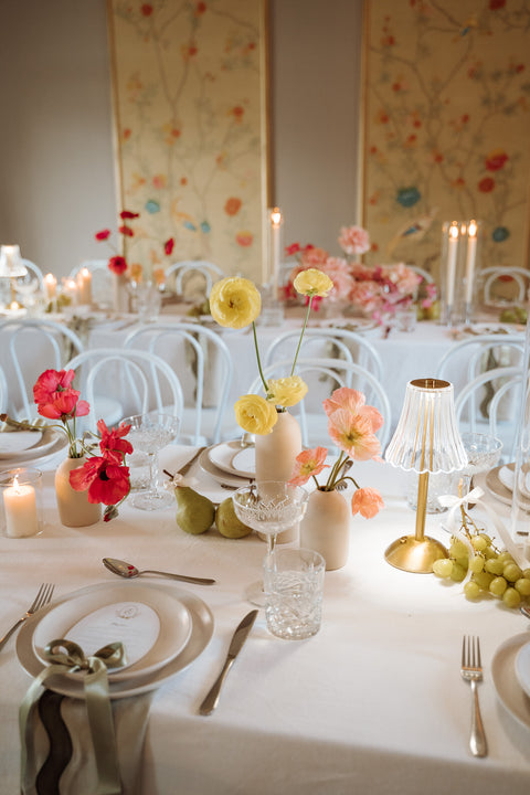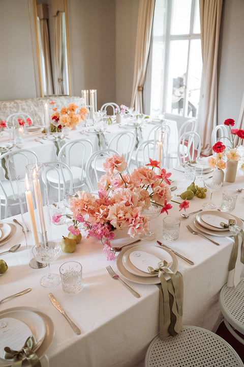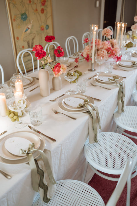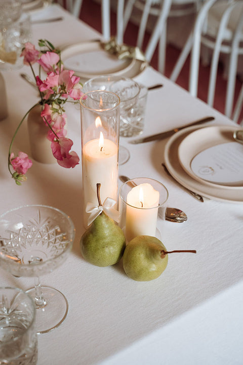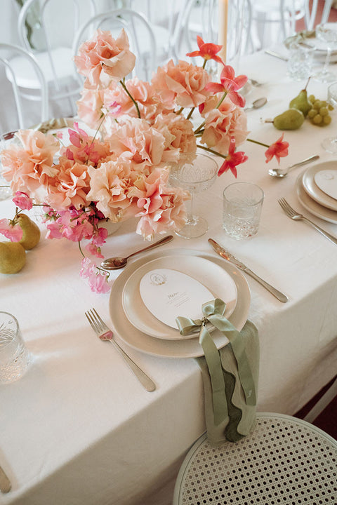 I had the pleasure of crafting bespoke menus for Gabi and Todd. They were adorned with a hand-painted watercolour monogram crest — featuring pears (as seen on their tables!) Each menu was finished with a delicate ribbon bow and personalized with guests' names, blending practicality with elegance. This thoughtful detail added an extra layer of charm to the tablescape, making guests feel truly special.
