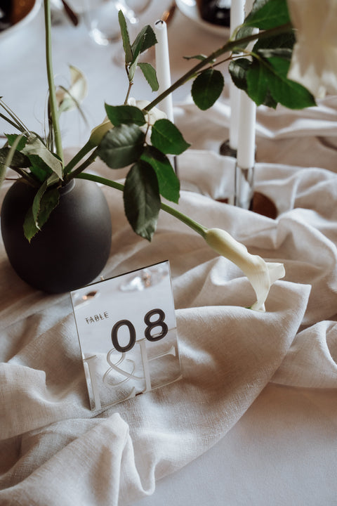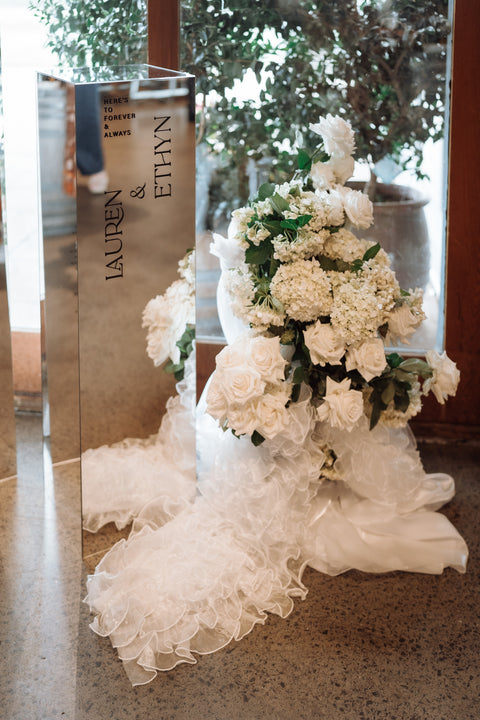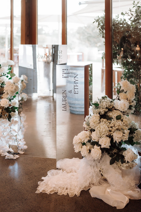 From the moment guests arrived, the signage set the tone for the day. A striking silver plinth installation greeted everyone with a beautifully reflective silver mirror acrylic seating chart. It was bold, contemporary, and a true statement piece that reflected the modern aesthetic woven throughout the celebration.