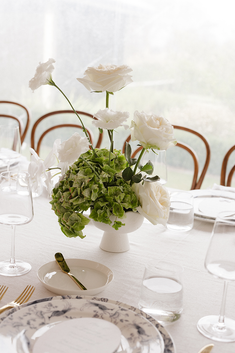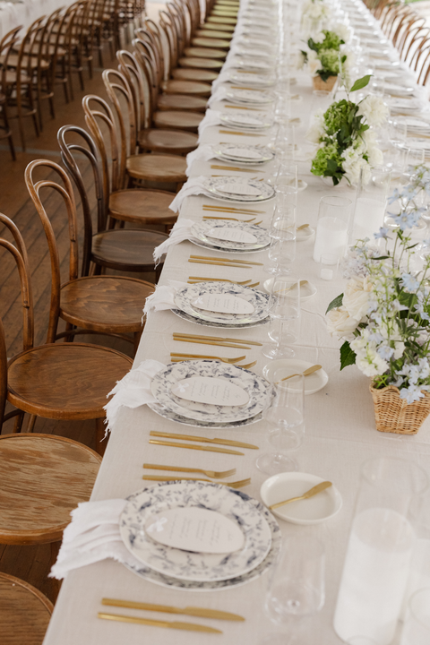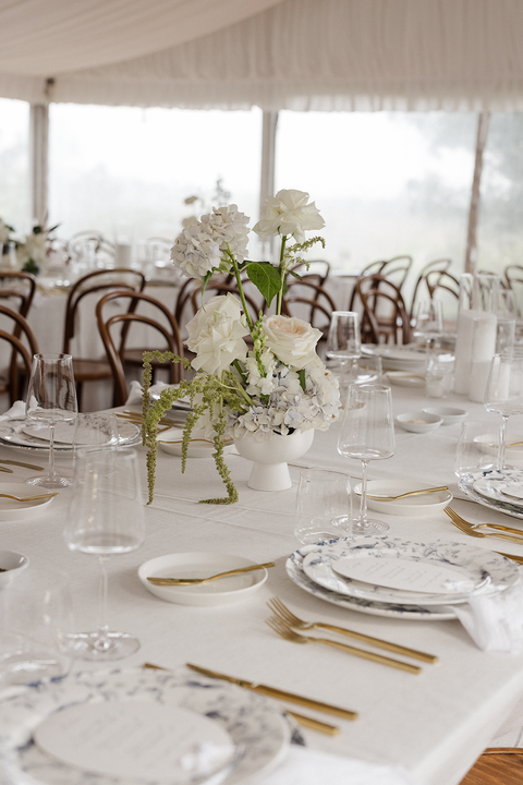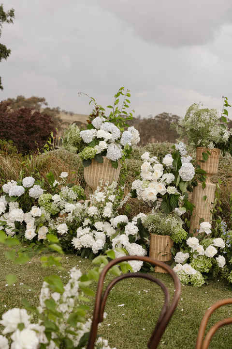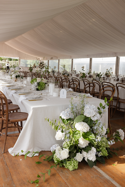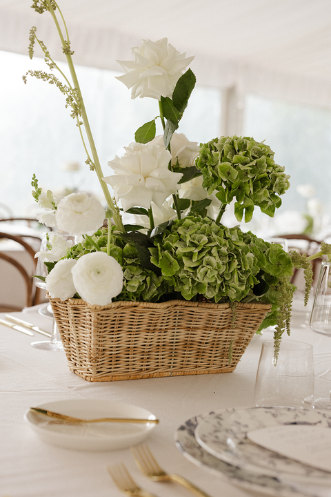 And then… the florals. Wow. Think wicker baskets overflowing with hydrangeas and roses, spilling soft blooms in creamy whites and pale blues throughout the marquee. The entire space felt like a midsummer garden — fresh, romantic, and just a little bit whimsical.