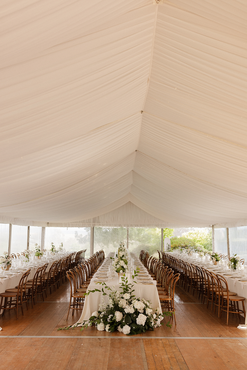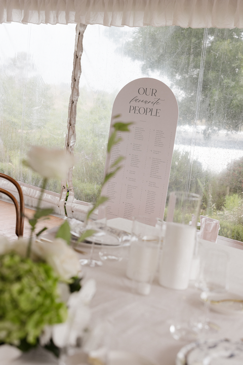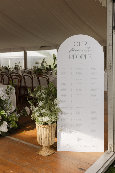 Guests were welcomed into the marquee by a tall, freestanding seating chart, designed with a sleek arched silhouette that tied in perfectly with their arch-shaped table numbers. This visual consistency created a beautifully cohesive look, guiding guests through the space with ease and elegance.