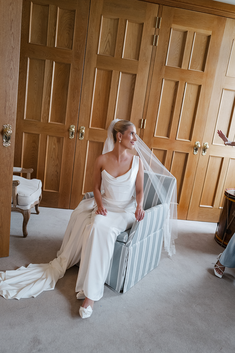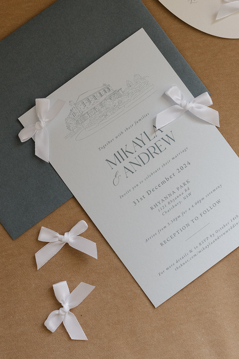 We began their stationery story with custom invitations featuring a hand-drawn illustration of their stunning venue — a personal and whimsical touch that set the tone for the day. This sweet sketch later made another appearance on their soft satin welcome sign, which glowed in the most delicate shade of light blue.