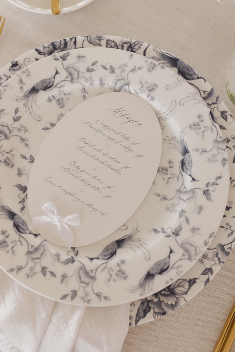 From there, every detail was thoughtfully curated to reflect Mikayla and Andrew’s elegant style. Their oval-shaped menus, adorned with flowing calligraphy and finished with tiny satin bows, brought a soft romantic flair to each place setting.