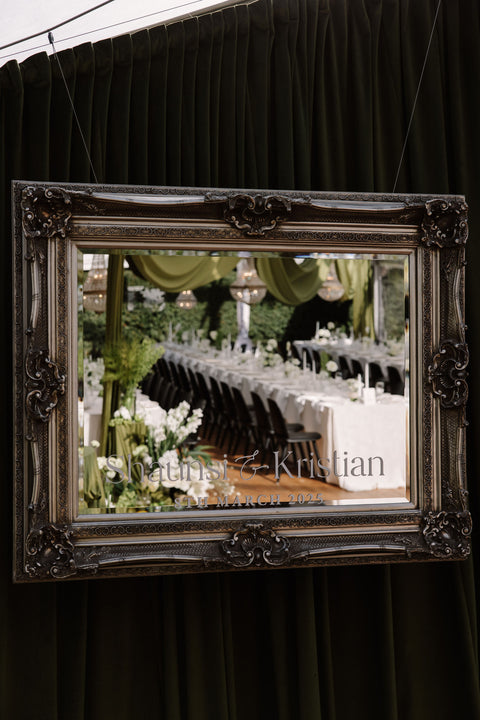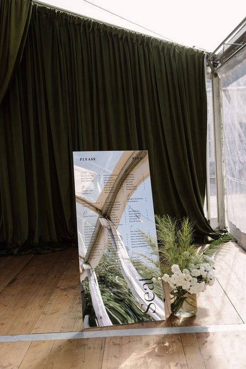 Signage played a starring role throughout the day. Moss green velvet and mirror acrylic came together in the most sophisticated way — from the showstopping seating chart to the sleek bar design. The table settings were pure elegance: handmade beige paper menus paired with name cards, all finished with a black ribbon bow for that final luxe detail.