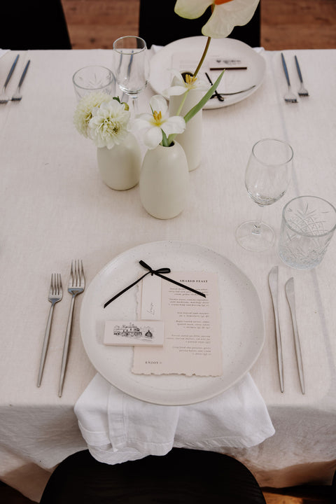 From the very beginning, every detail was designed to set the tone. Their invitations were a work of art: white handmade paper, finished with green letterpress. Soft, textural, and oh-so elegant, the suite hinted perfectly at the magic to come.