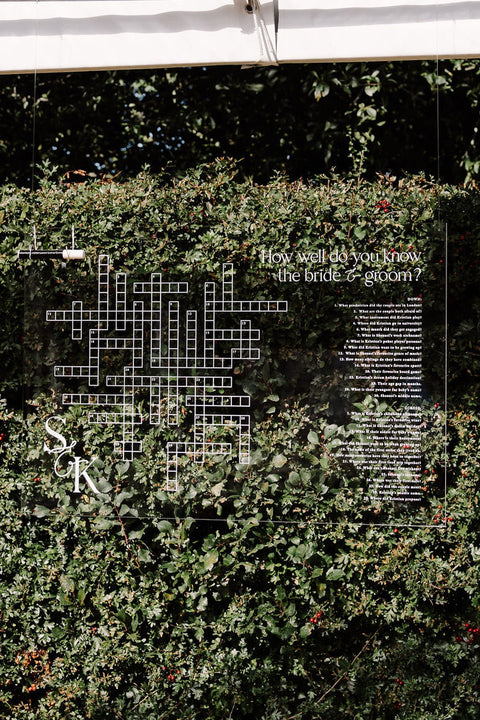 And for a playful twist? Guests were treated to a custom clear acrylic crossword puzzle sign filled with clues about the couple — an interactive feature that had everyone laughing, mingling, and celebrating love in the most unique way.