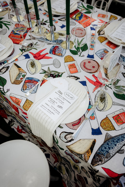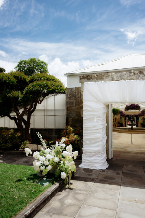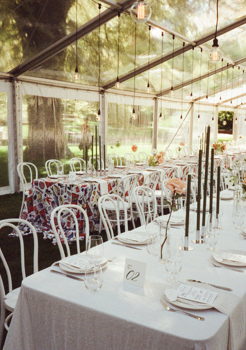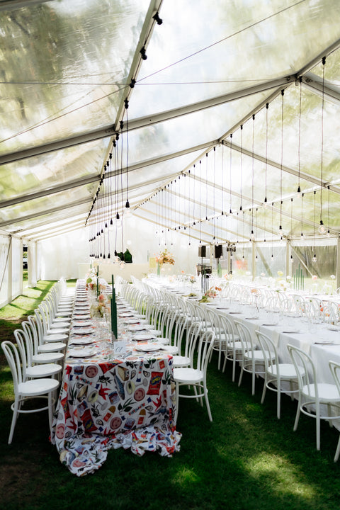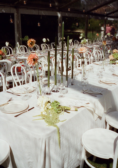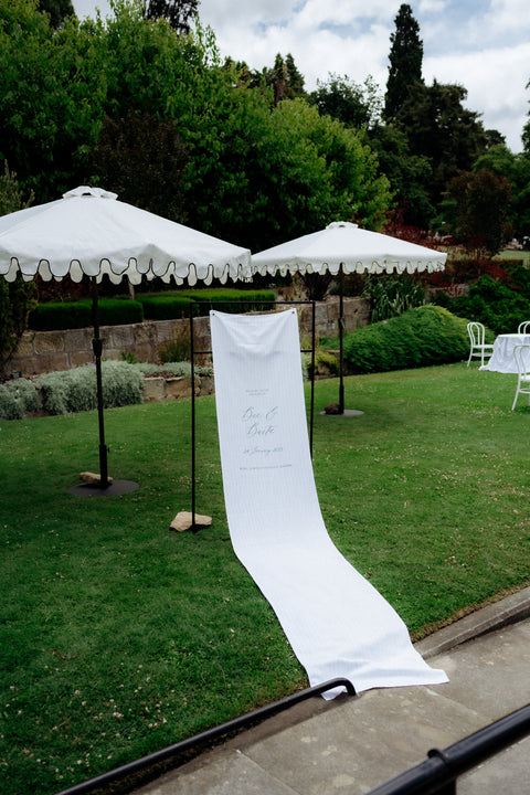 Let’s talk about that linen welcome sign — a 3-metre-long statement piece with a soft pinstripe running through it, echoing the napkins at each place setting. It was such a subtle, beautiful way to carry their styling thread through the space, and it set the tone perfectly.