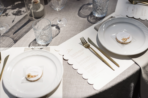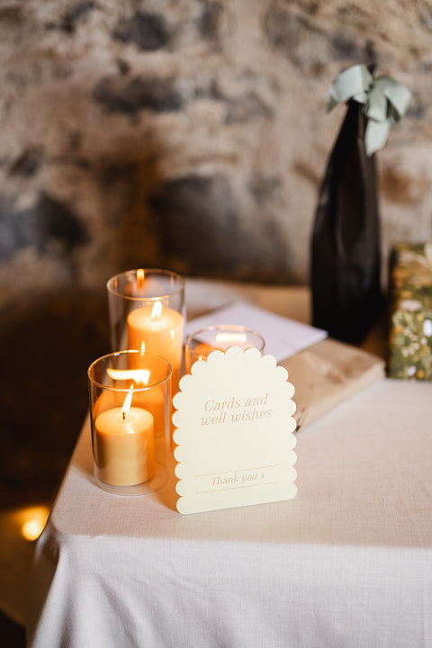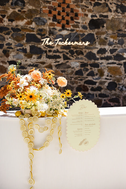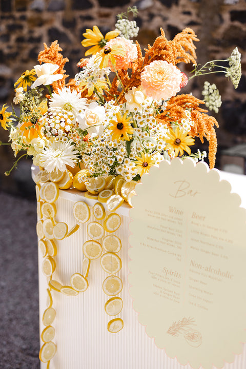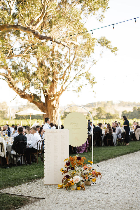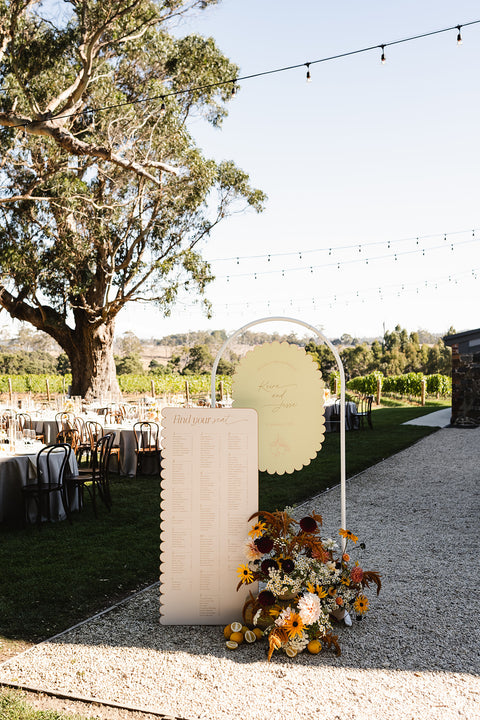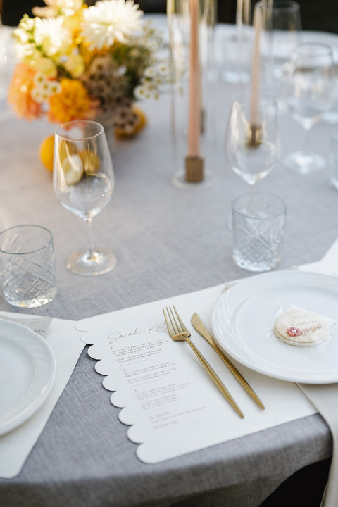 One of the standout elements was the custom scallop shape we created for them. This playful motif made an appearance throughout the day – from the curved edges of their welcome sign and bar signage, to the scalloped arch-shaped table numbers and their show-stopping seating chart. We even designed bespoke scalloped placemats for each guest’s setting, adding a fun and unexpected detail to the tablescape that tied everything together beautifully.